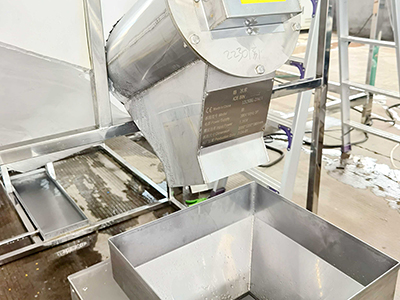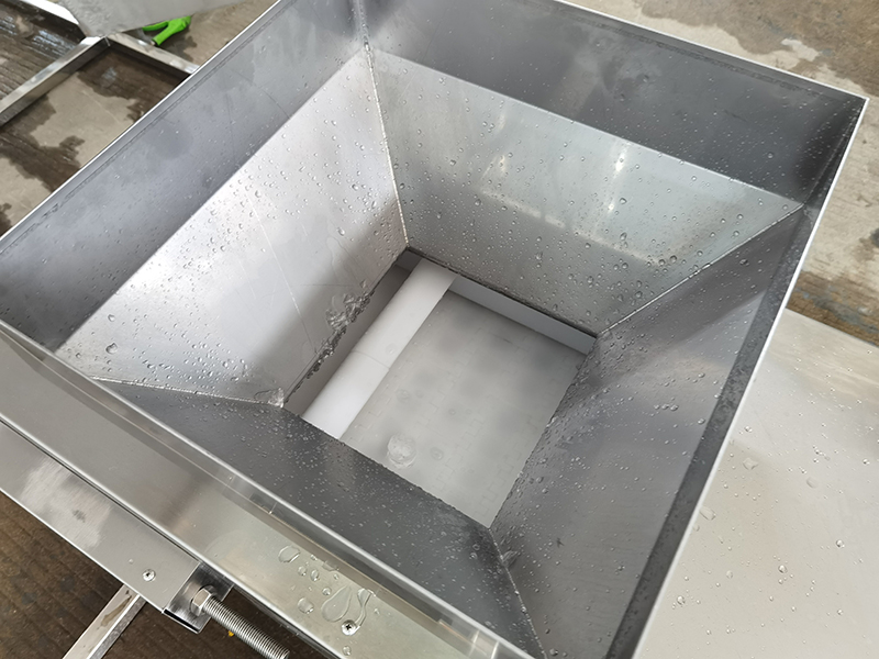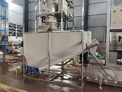 Salida del tanque de almacenamiento de hielo sobre la tolva de alimentación