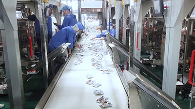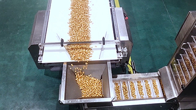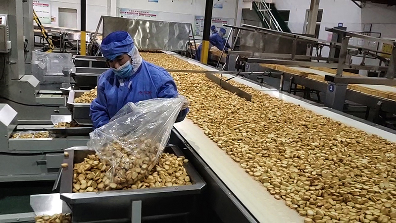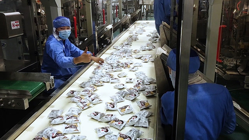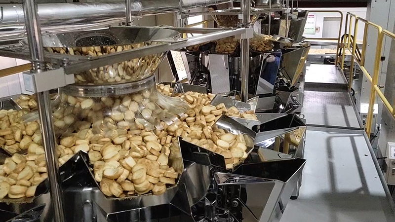 De acuerdo con los requisitos de la fábrica, SOONK personalizó especialmente el transportador automático para alimentación y envasado automáticos, lo que logra una automatización completa. Esta envasadora automática de galletas viene con operación automática de la línea de ensamblaje y descarga automática de bolsas empaquetadas. La línea de envasado consta de 10 sets de envasadoras vertical SK-L420 con llenador de copa volumétrica, 10 sets de pesadora de 10 cabezales, 10 sets de plataforma de soporte, 10 sets de transportador de producto terminado y 2 sets de sistemas de transporte.