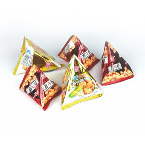 La bolsa pirámide es compacta y se destaca entre otras. Esta bolsa sirve para envasar productos granulares o en pequeñas piezas como té, caramelos, snacks y muchos otros.